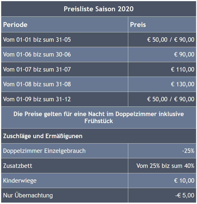 Die Preise beinhalten: reiches Frühstück, tägliche Zimmerreinigung, Wäschewechsel (alle 4 Tage), auf Anfrage Handtuchwechsel, Küchengebrauch für Kinder, Fahrradservice.